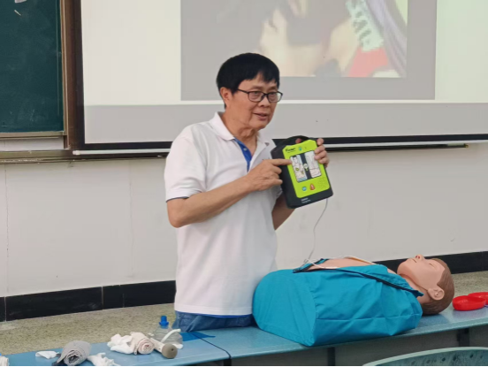 急救技巧教学是本次讲座的重点,除了常见的心肺复苏和海姆立克法外,榕嘉老师重点介绍了AED自动体外除颤器使用方法和止血包扎技巧。在AED使用教学中,他结合实际案例,还原了从发现患者倒地、判断意识呼吸,到使用AED进行除颤的全过程。“很多人担心使用AED会电错人,但设备有智能检测系统,只有检测到可除颤心律时才会发出电击指令,所以大家一定要克服恐惧,大胆使用。”